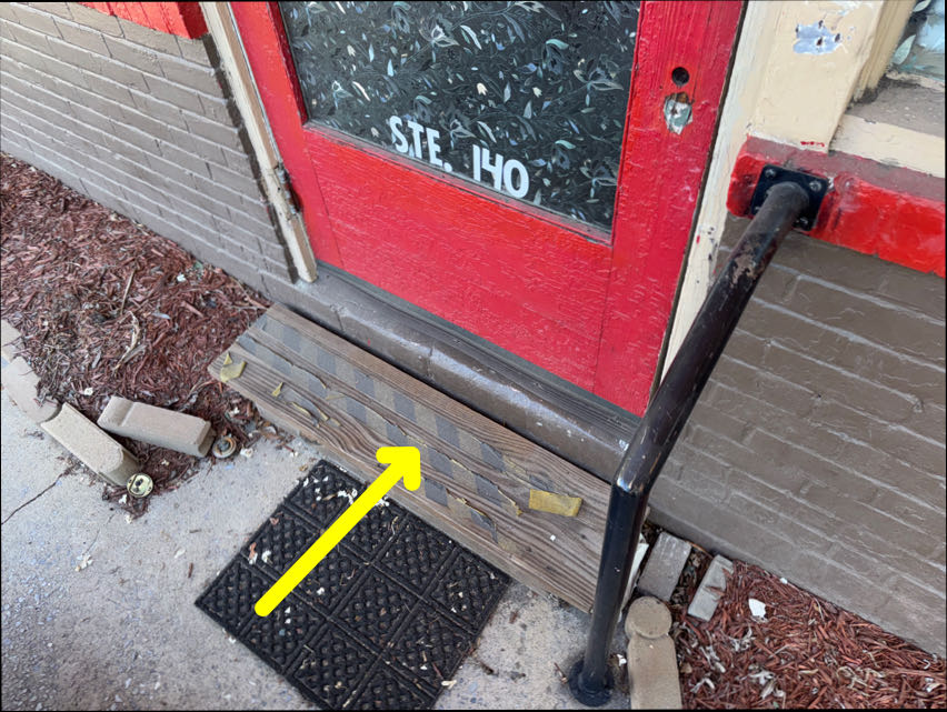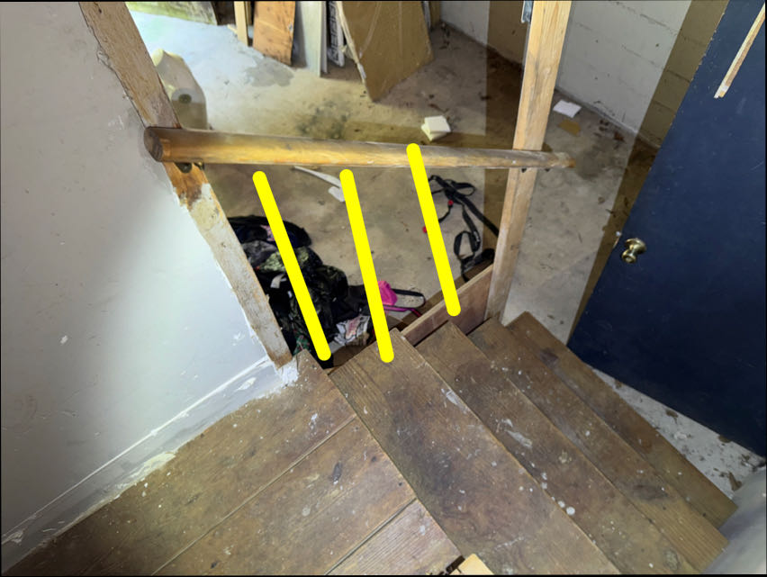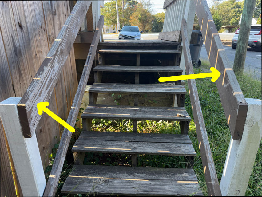 5.2. Missing spindles observed at interior stairs at access area to basement level with exterior door labeled 1. This is a safety hazard and should be corrected. 5.3. Missing railings observed at Suite 160 front steps |