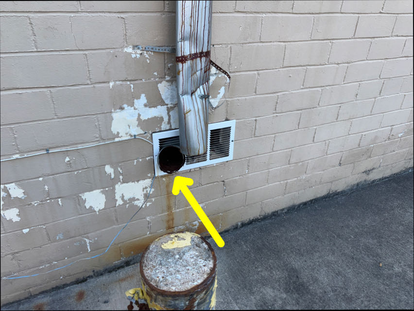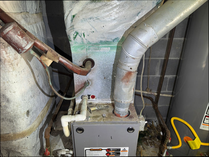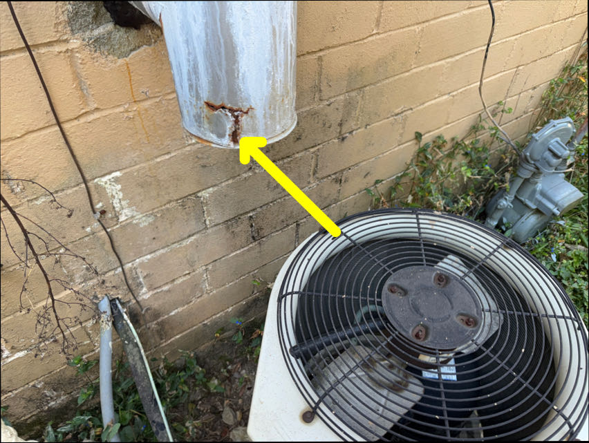 Metal 4.1. Any fans, vents, or other exhaust appliances in the home may affect the air pressure in the building and reduce proper venting. It is recommended to make sure there is proper combustion air The ductwork installed to bring fresh outside air to the furnace and/or hot water heater. Normally, two separate supplies of air are brought in: one high and one low. to prevent exhaust gases from leaking back into the building. 4.2. Detached vent pipe, observed at furnace exhaust on left side of building. This condition should be corrected. 4.3. Rust observed on furnace exhaust pipe at rear left. This is a safety hazard and should be corrected |