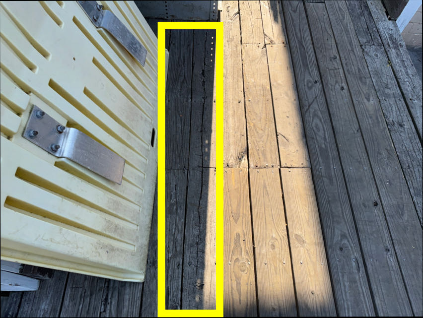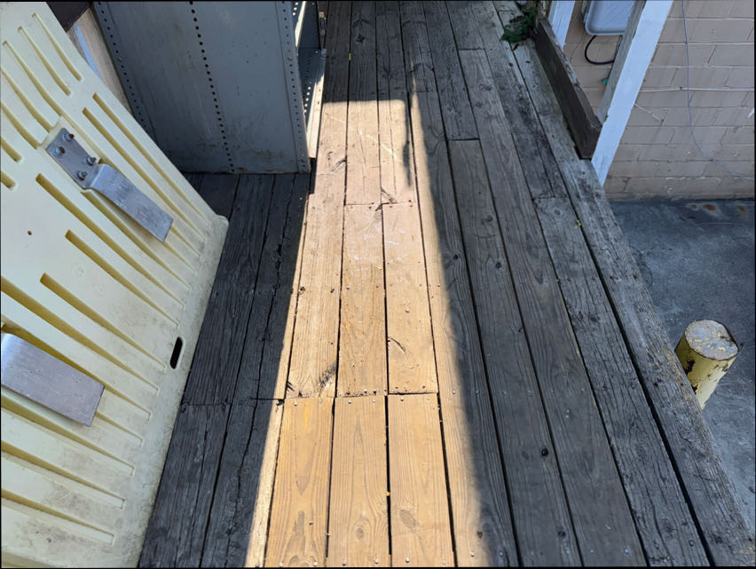 7.1. Damaged flooring observed at one or more areas at work area flooring. Repair to ensure safe workspace and ease of equipment movement.