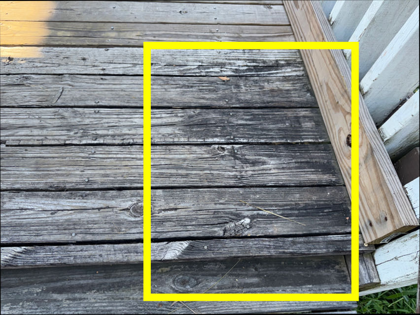 • Wood support posts 1.1. The flashing and connections between the deck framing and the siding are visually examined only and are not always visible. It is recommended to bring all decks (older and newer) up to current standards for deck safety. This includes framing, support, attachment to the home, flashing, handrails, and stairs as needed. 1.2. Wood deck support posts/framing should not be in direct contact with soil and will increase rate of deterioration and increase potential for movement/wood destroying organism activity 1.3. Deck is weathered and is due for a water proofing sealer to extend life expectancy. 1.4. Multiple weathered and/or split deck boards noted. Suggested to have all worn deck boards replaced and sealed as needed. 1.5. There is no visible flashing where deck meets building. The joint between the deck and the building should be flashed to prevent water penetration where the deck is bolted to the building. 1.6. The deck appears to be nailed to the structure. Nails may pull out and fail. It is recommended to have the deck properly bolted and secured where it meets the rear of the building. 1.7. It is recommended to install metal plates and fasteners to secure connections of the deck framing and the wood posts to the deck framing. 1.8. Access to rear left side deck was blocked. This area was not inspected. 1.9. There were multiple issues noted with the deck on the building. It is suggested to have the entire deck reviewed and all repairs made by a licensed decking contractor. See photographs for example issues and locations. |