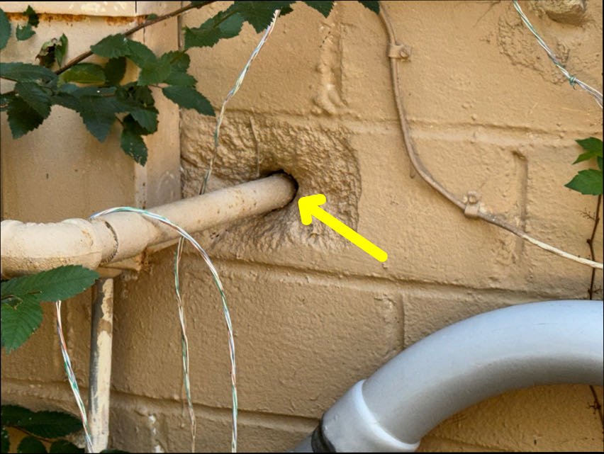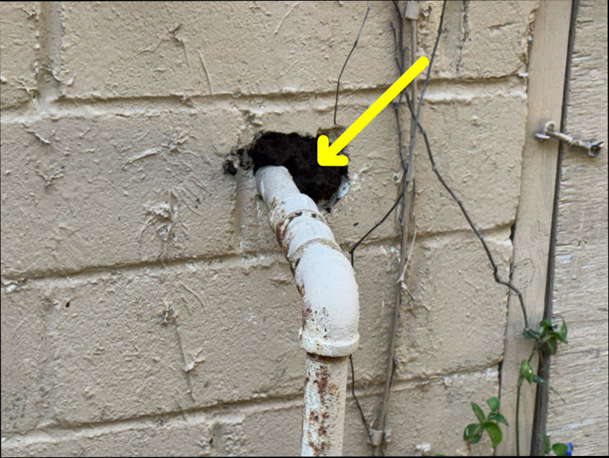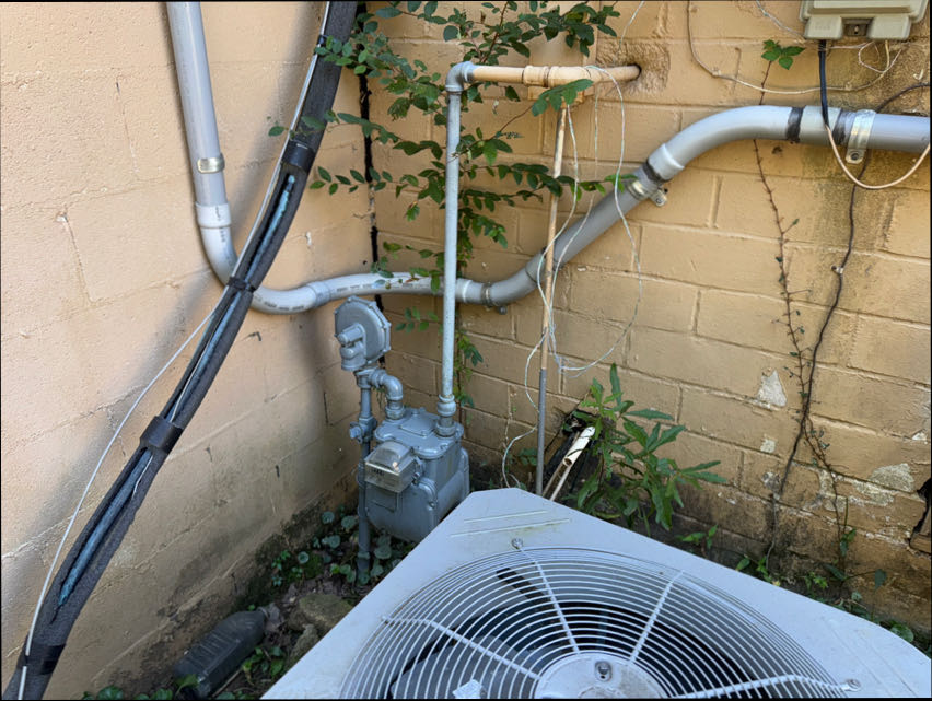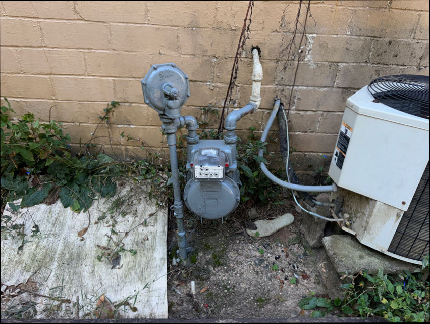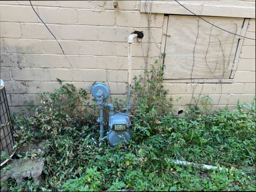 • The gas meter manifold is for three meters 1.1. Pipes penetrate through masonry wall in a large irregular hole in the masonry. Recommend installing metal sleeves around the pipes and patching the masonry wall for fire resistance. 1.2. Gas meter(s) at the rear 1.3. Uncapped gas line observed in Suite 160 front room. This is a safety hazard and should be prepared. |