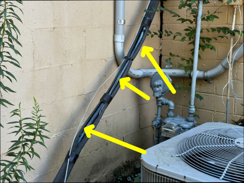 Electric meter and shut off are at the rear side of the property. Electric meter is on the rear exterior side. Service entrance is overhead Service conductors are SEU type encased in pvc sheath Observations: 1.1. Main electrical disconnect noted at the meter base. 1.2. Some of the electrical meters were not clearly labeled by individual unit 1.3. Exposed main entrance wiring should be protected in conduit and shielded. Have a licensed electrical contractor review and correct as needed. 1.4. The overhead electric service entrance cables are in direct contact with tree limbs. Recommend review by the local utility company or a licensed electrician for correction. |