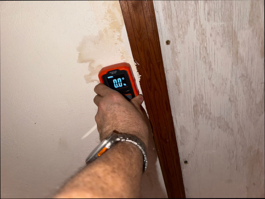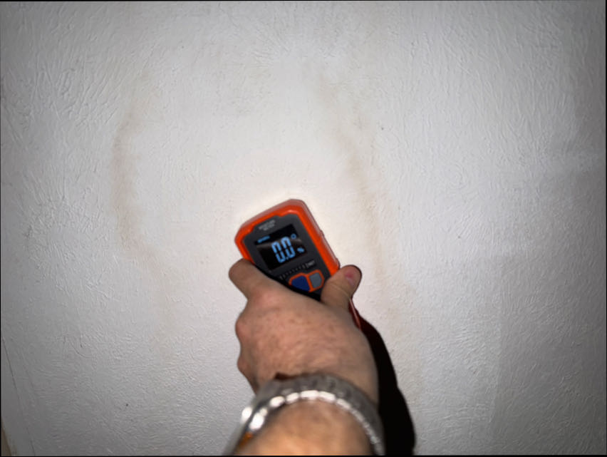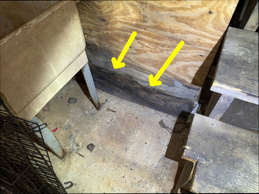 7.2. Moisture stains, observed at wood wall at rear portion of garage/basement area at left side. Dry at time of inspection. |