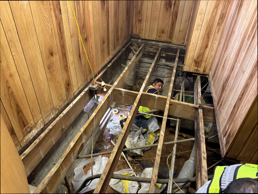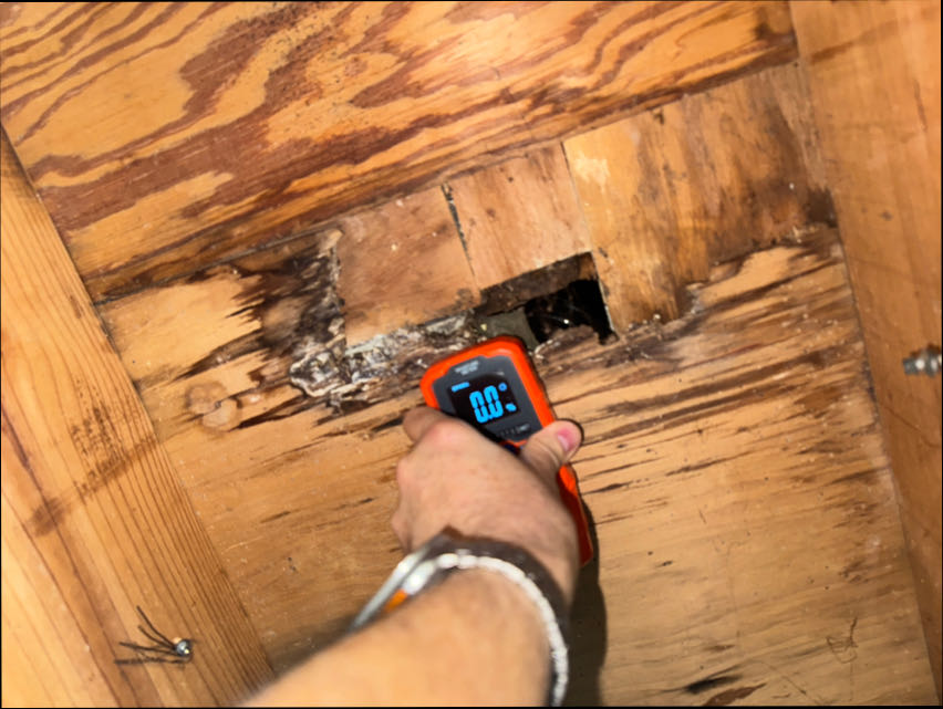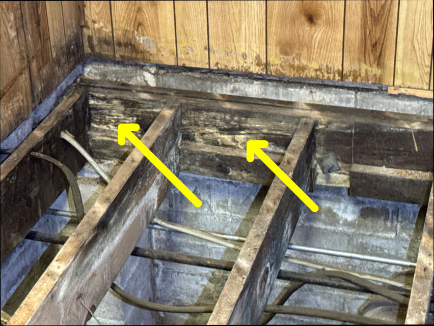Joist construction 3.1. Subfloor damage observed in basement access from exterior door labeled 1. Dry at time of inspection. 3.2. Moisture stains, observed on joists and subfloor in basement area access from exterior door labeled 1. Dry at time of inspection. 3.3. Water damage observed in framing above Suite 100 crawlspace 3.4. Repairs were being performed on under floor structural components behind Suite 100 at time of inspection. |