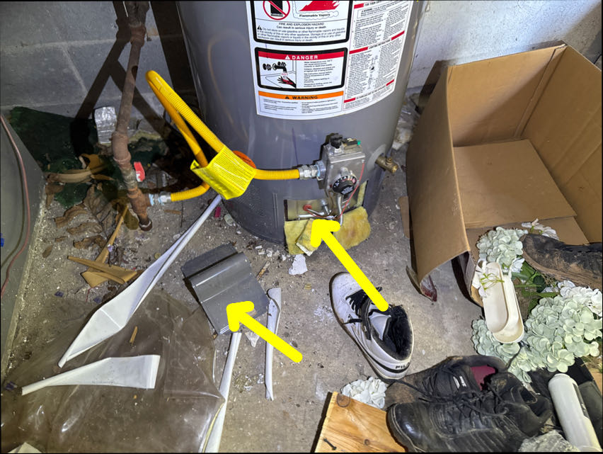 | 3.1. Detached cover observed at base of water heater in basement area access from exterior storage door labeled one. |