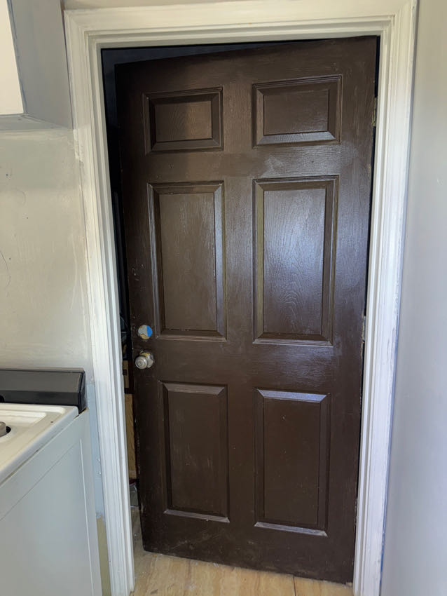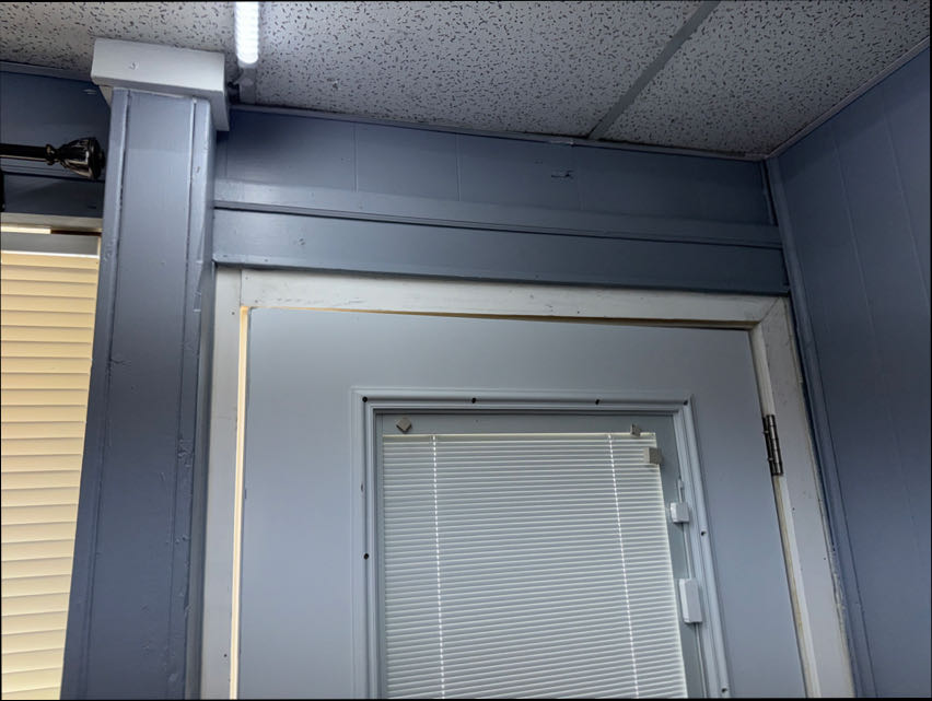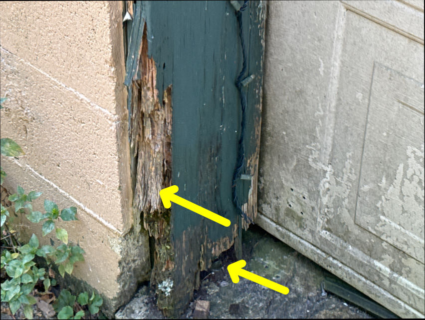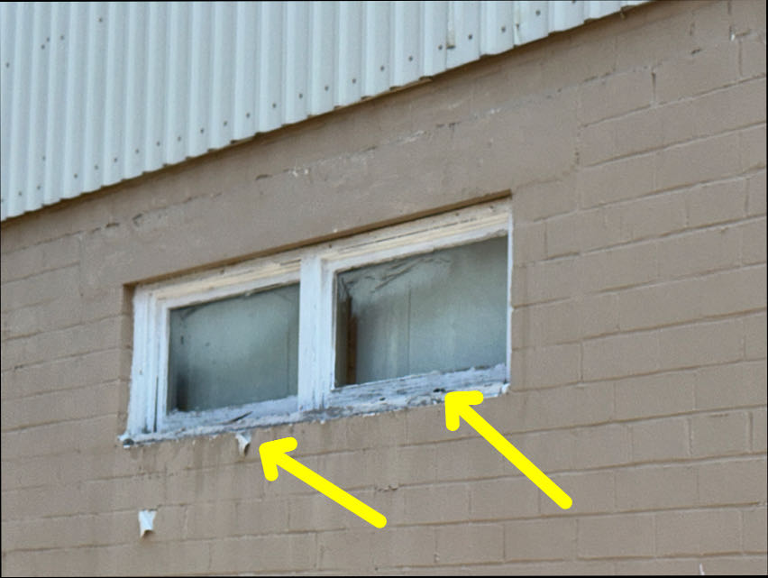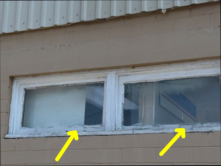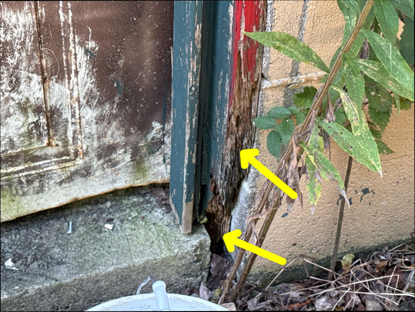 • Steel security • Wood • Aluminum storefront material with tempered glass • Curtain wall • Panel • Wood Frame 2.1. Missing weatherstripping noted at one or more exterior doors 2.2. Damage and rust with missing weatherstripping observed at rear exterior basement access door labeled 1 2.3. Center overhead door did not close completely and had gaps in weatherstripping 2.4. Missing latching mechanism observed at left side exterior overhead door 2.5. Unpainted and deteriorated trim observed at left side, wood window frames |