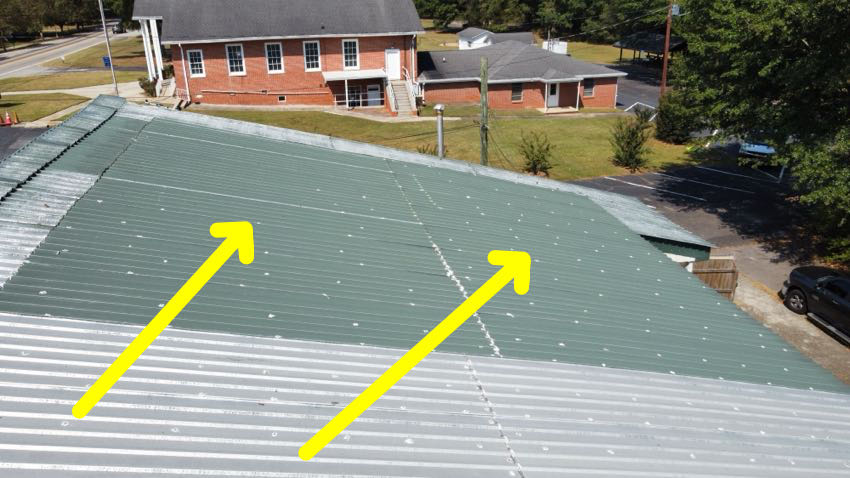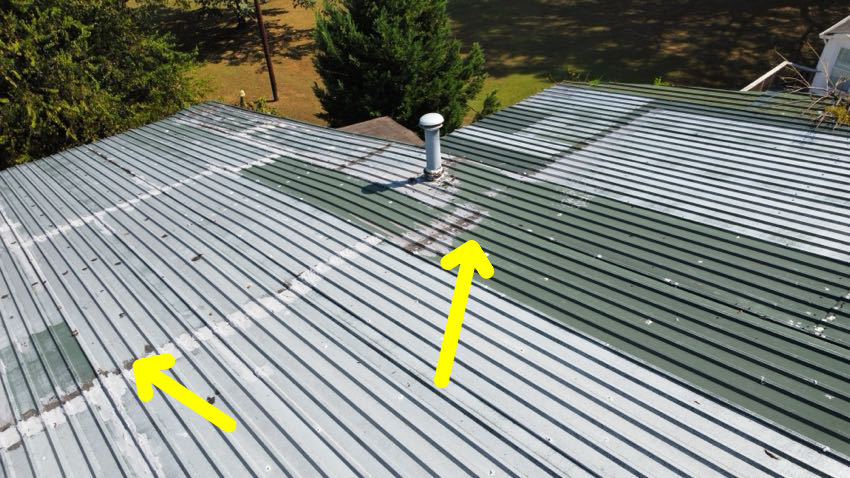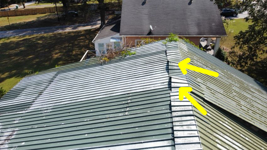 The property had a gable roof structure A portions of the roof covering type was Asphalt shingles Roof covering type was metal • Improper storage of items observed on roof. Storing items on a roof can cause damage. Recommend removal. • Repairs observed at various areas of metal roofing. • Bent roof covering observed at ridge on right side. • Damage to shingles observed at asphalt portion of roof covering at rear, right |