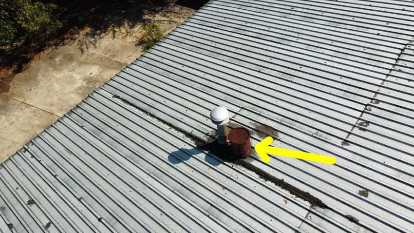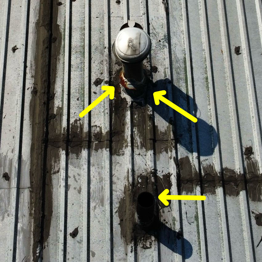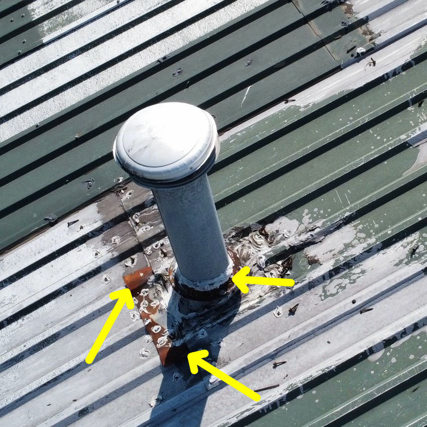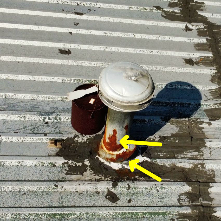 • Pitch pocket 2.1. Rusted metal flashing observed at one or more areas on the roof. 2.2. Flashing sealant repairs observed at one or more areas on the roof. 2.3. Improper vinyl flashing observed at asphalt portion of roofing at rear, right |