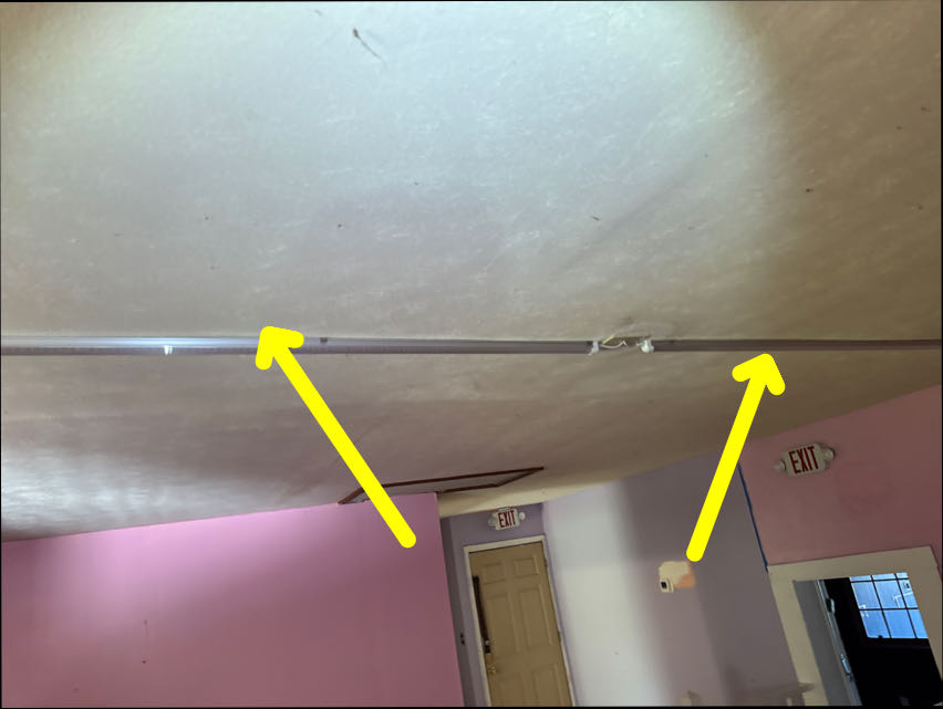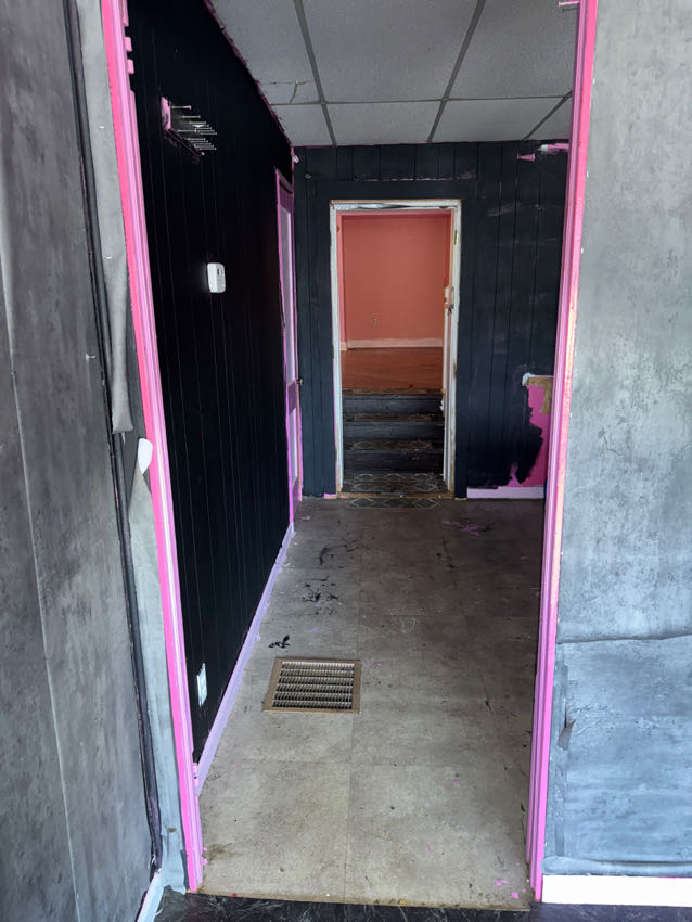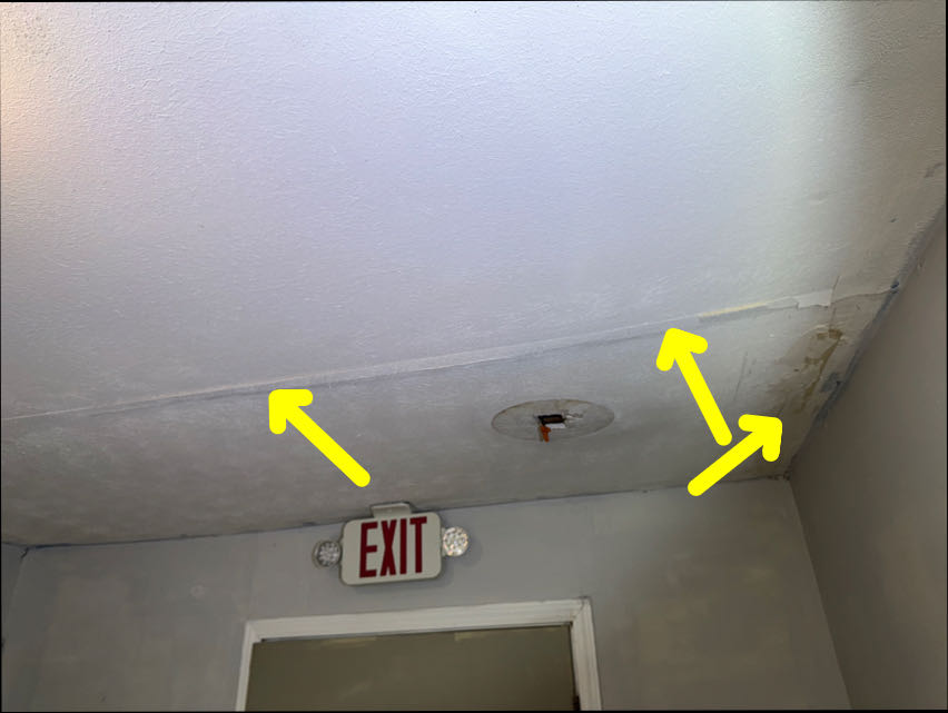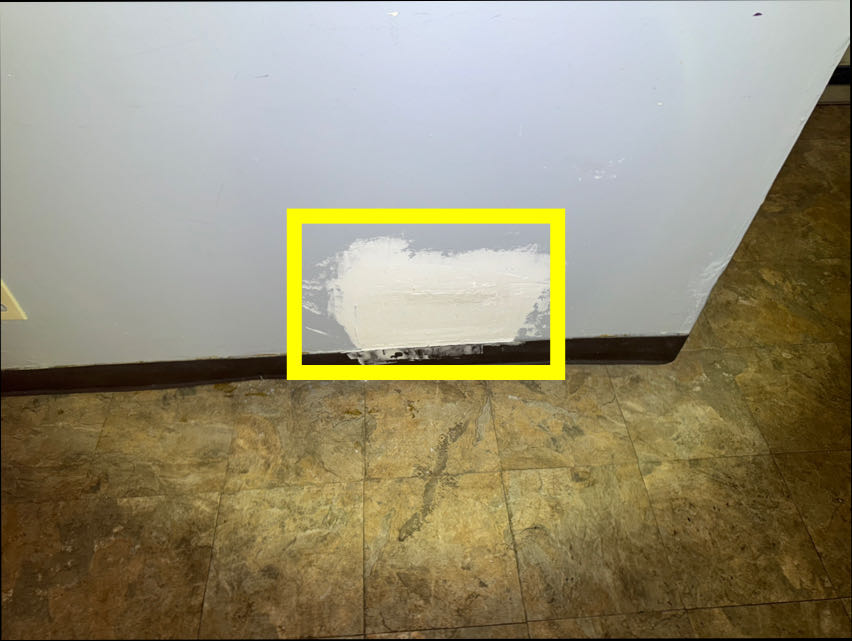 3.2. Evidence of repairs observed at one or more interior walls. There was no evidence of current leaks. 3.3. Nonprofessional repairs observed in Suite 130 bathroom wall 3.4. Missing drywall observed at Suite 160 entryway 3.5. Missing section of drywall observed in Suite 160 front bathroom 3.6. Missing drywall at Suite 160 front room 3.7. Loose and damaged ceiling tiles observed in Suite 160 3.8. Multiple areas of missing wall covering observed in Suite 160 |