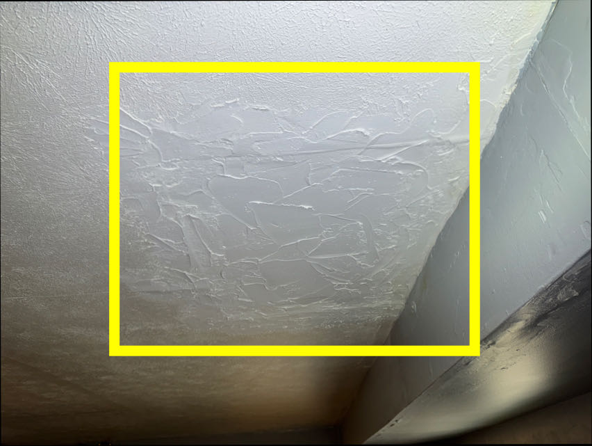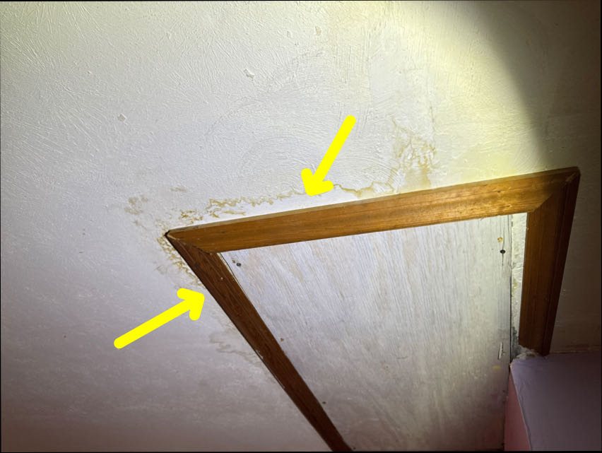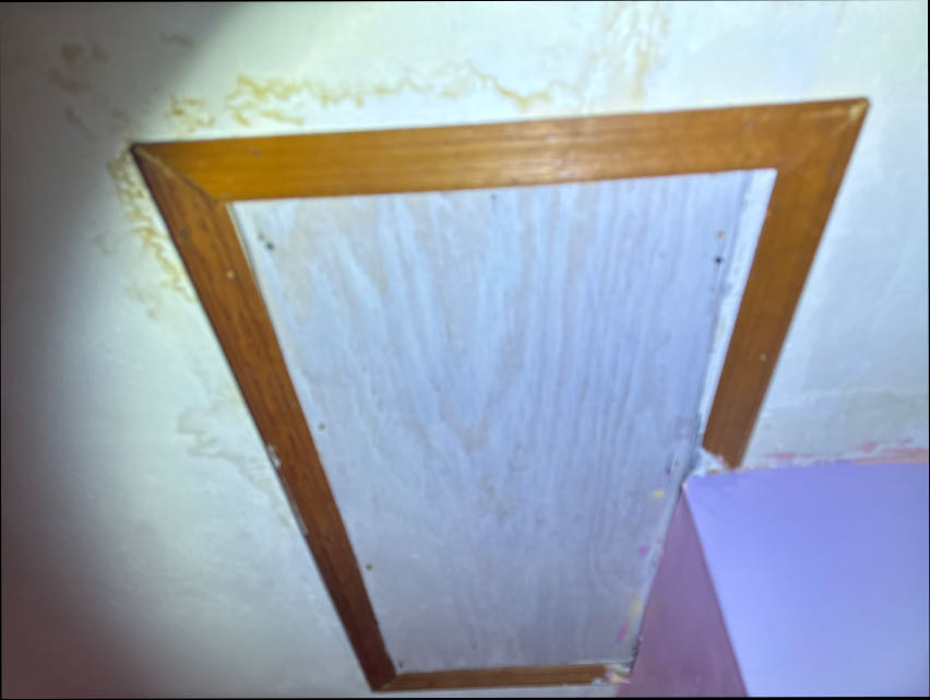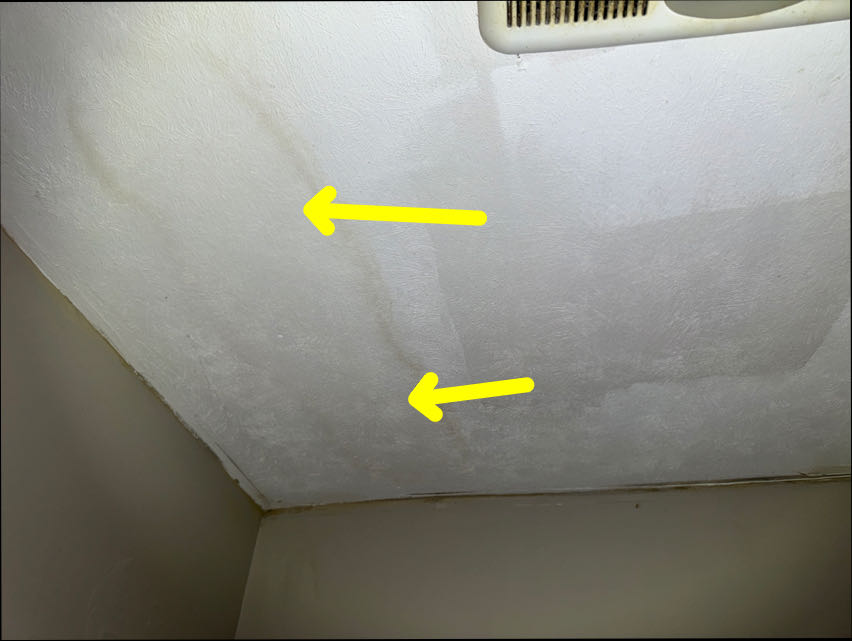 4.1. Evidence of repairs observed. There were no active leaks noted at the time of inspection. At the time of inspection, there was no way to determine the cause of the original damage. Suggest referring to the sellers regarding any prior repairs.