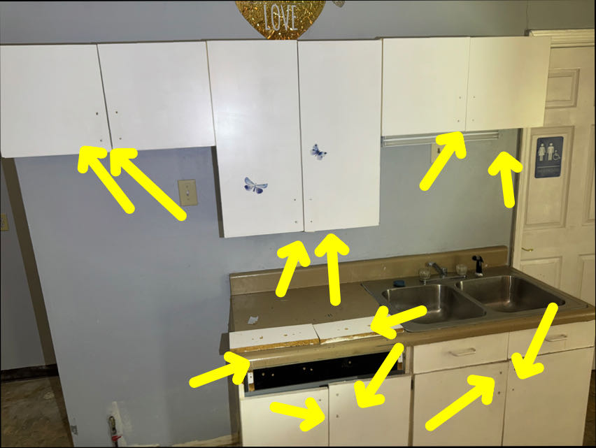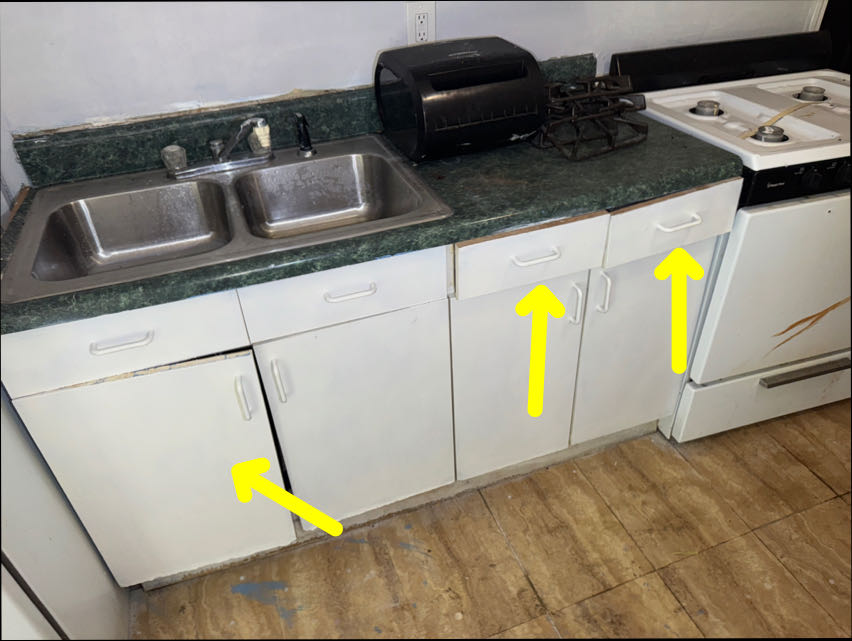 1.2. Misaligned cabinets and drawers observed in Suite 130 kitchen area 1.3. Detached covers and missing hardware observed at Suite 140 kitchen cabinets 1.4. Upper cabinets are pulled loose from wall. This condition should be corrected for safety. |