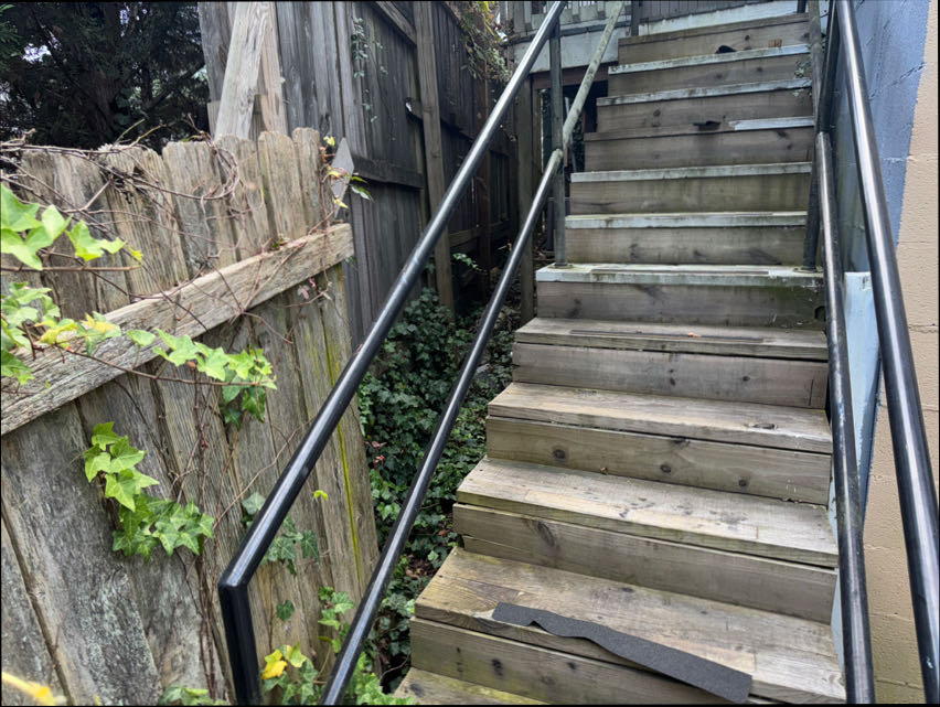 • Wood railings 3.1. Minor settlement or “hairline” cracks in drives, walks, concrete stairs and ramps or even foundations are normal to properties of any age. They should, however, be monitored for expansion and sealed as necessary. 3.2. Damage observed at wooden exterior steps at left side. This condition should be corrected. 3.3. Loose handrail observed at left side wooden stairs. This is a safety hazard and should be corrected. 3.4. Loose rail observed at left side deck area. This condition should be corrected for safety. |